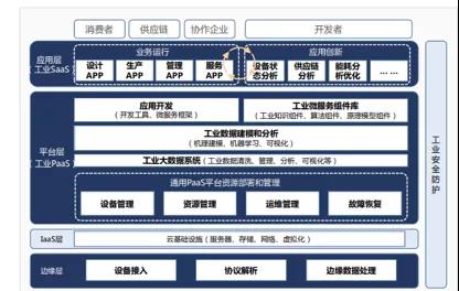 因此,工業(yè)互聯(lián)網(wǎng)平臺(tái)自下而上分別為解決設(shè)備互聯(lián)的邊緣層、云基礎(chǔ)設(shè)施所在的IaaS層、平臺(tái)層PaaS層和工業(yè)應(yīng)用層SaaS層。