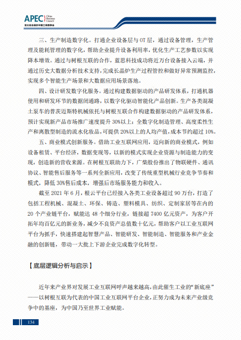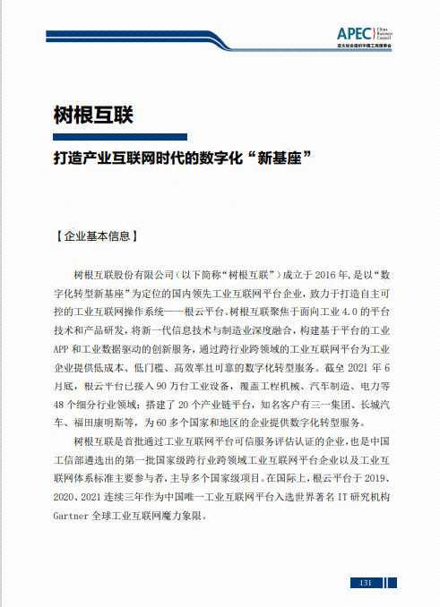 12月25日,中國加入APEC三十周年工商界主題活動暨2021年APEC工商領導人中國論壇在北京舉辦,同期發布了“中國數字經濟產業示范樣本行動”系列成果。其中,樹根科技憑借打造產業互聯網時代的數字化“新基座”,入選“中國數字經濟產業示范樣本50”企業;另外,在紀念“中國加入APEC三十周年”的年度書籍《數字上的中國》中,樹根科技成為了案例提及量最高的企業,為促進數字經濟的可持續增長提供了最佳范例。