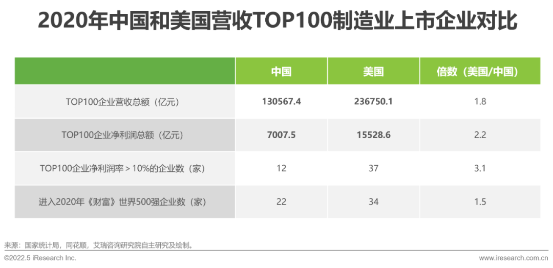 對(duì)比2020年中國(guó)和美國(guó)營(yíng)收TOP100制造業(yè)上市企業(yè)數(shù)據(jù),美國(guó)制造業(yè)企業(yè)凈利率超過(guò)10%的企業(yè)有37家,是中國(guó)的3.1倍。整體來(lái)看,美國(guó)制造業(yè)企業(yè)在營(yíng)收總額、凈利潤(rùn)等方面更具優(yōu)勢(shì)。通過(guò)將2020年中國(guó)和美國(guó)營(yíng)收TOP100制造業(yè)上市企業(yè)與2020年《財(cái)富》發(fā)布的世界500強(qiáng)名單對(duì)比發(fā)現(xiàn),美國(guó)有34家世界500強(qiáng)制造業(yè)上市企業(yè),而中國(guó)只有22家,美國(guó)的制造業(yè)企業(yè)知名品牌更多。