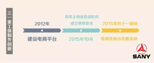 當(dāng)然,三一不只是跨界者,還需要防御被跨界。2012年,三一重工開始建設(shè)電商平臺,嘗試在傳統(tǒng)銷售環(huán)節(jié)的代理商模式中引入互聯(lián)網(wǎng)電商,2015年雙十一期間,三一重工還推出優(yōu)惠活動,電商上的數(shù)據(jù)表現(xiàn)很理想。